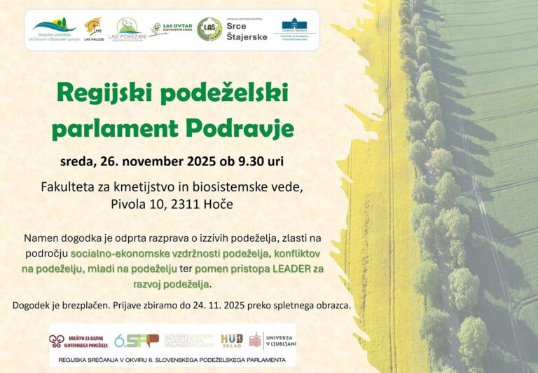 Vljudno vabljeni, da se nam pridružite na Regijskem podeželskem parlamentu Podravje. KDAJ: sreda, 26. novembra 2025 ob 9.30 uri LOKACIJA: Pivola 10, 2311 Hoče (v